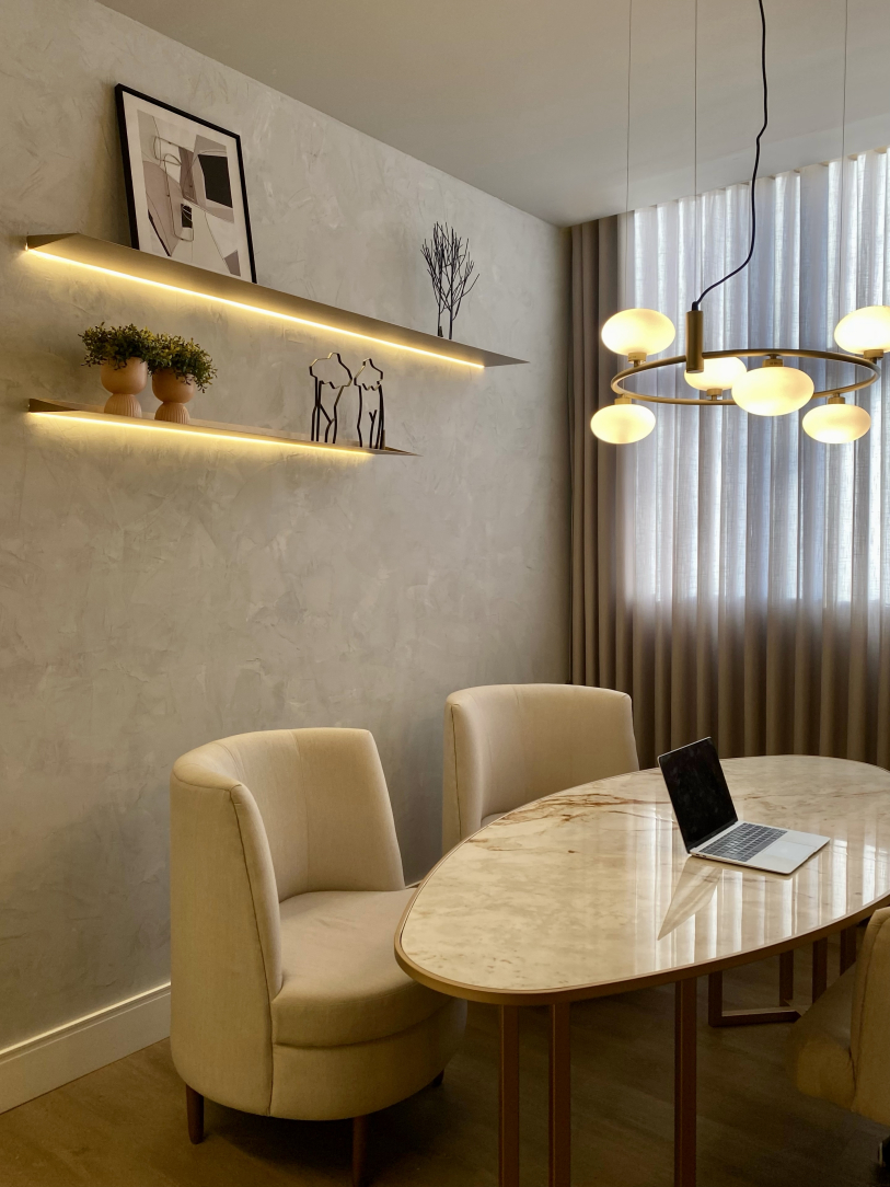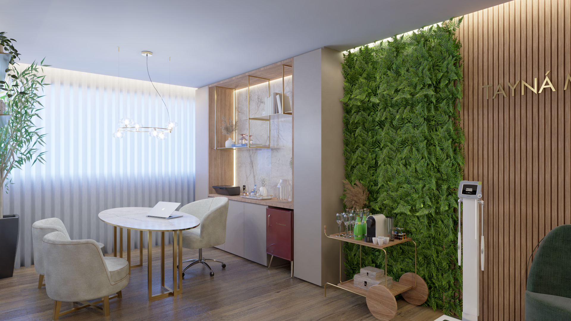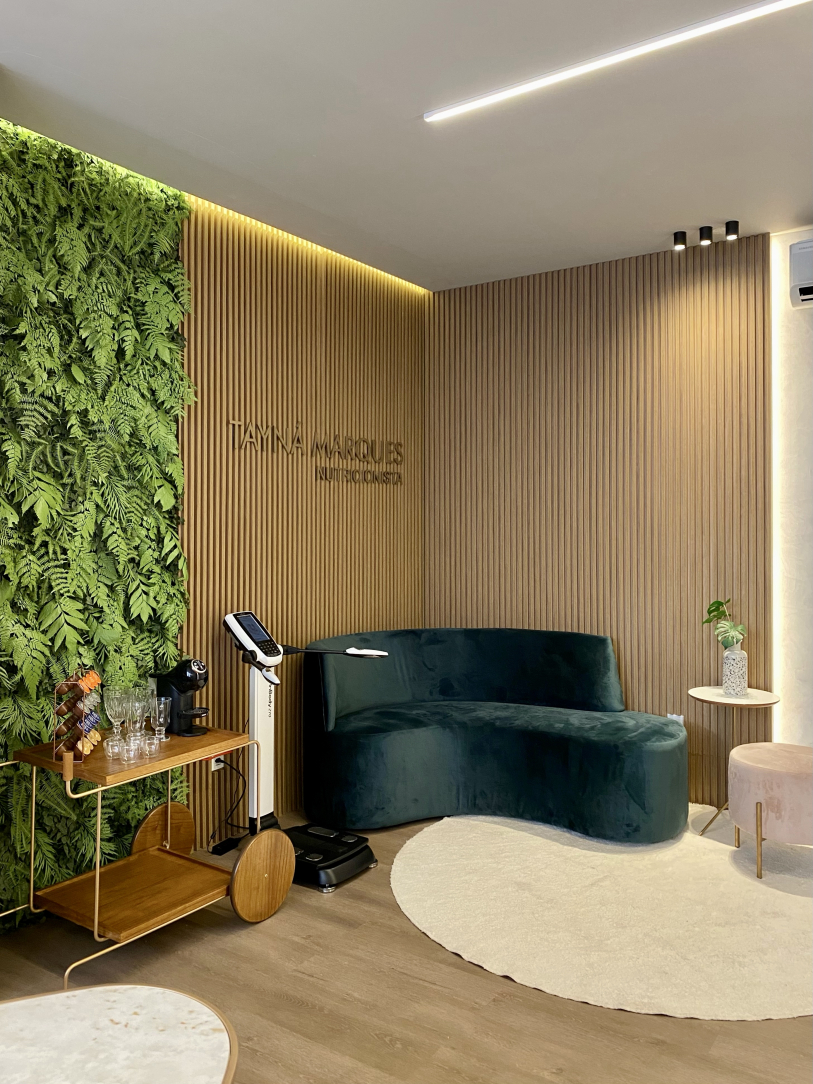 Elementos como o jardim vertical, maderia e as formas orgânicas remetem a natureza resultando em um espaço MODERNO, ACONCHEGANTE E ATEMPORAL!