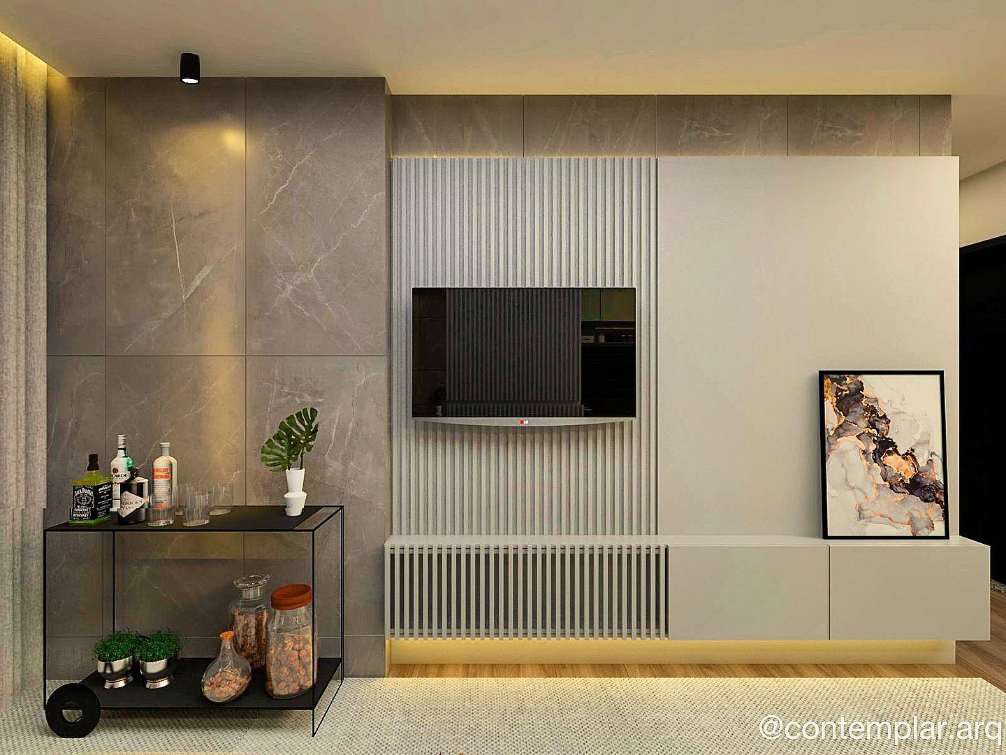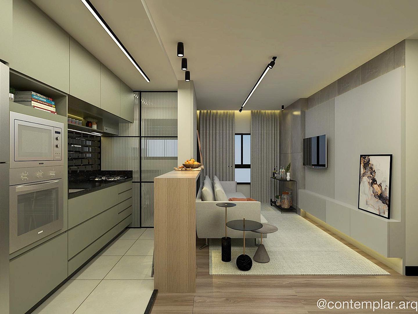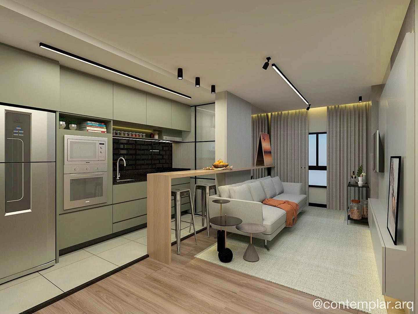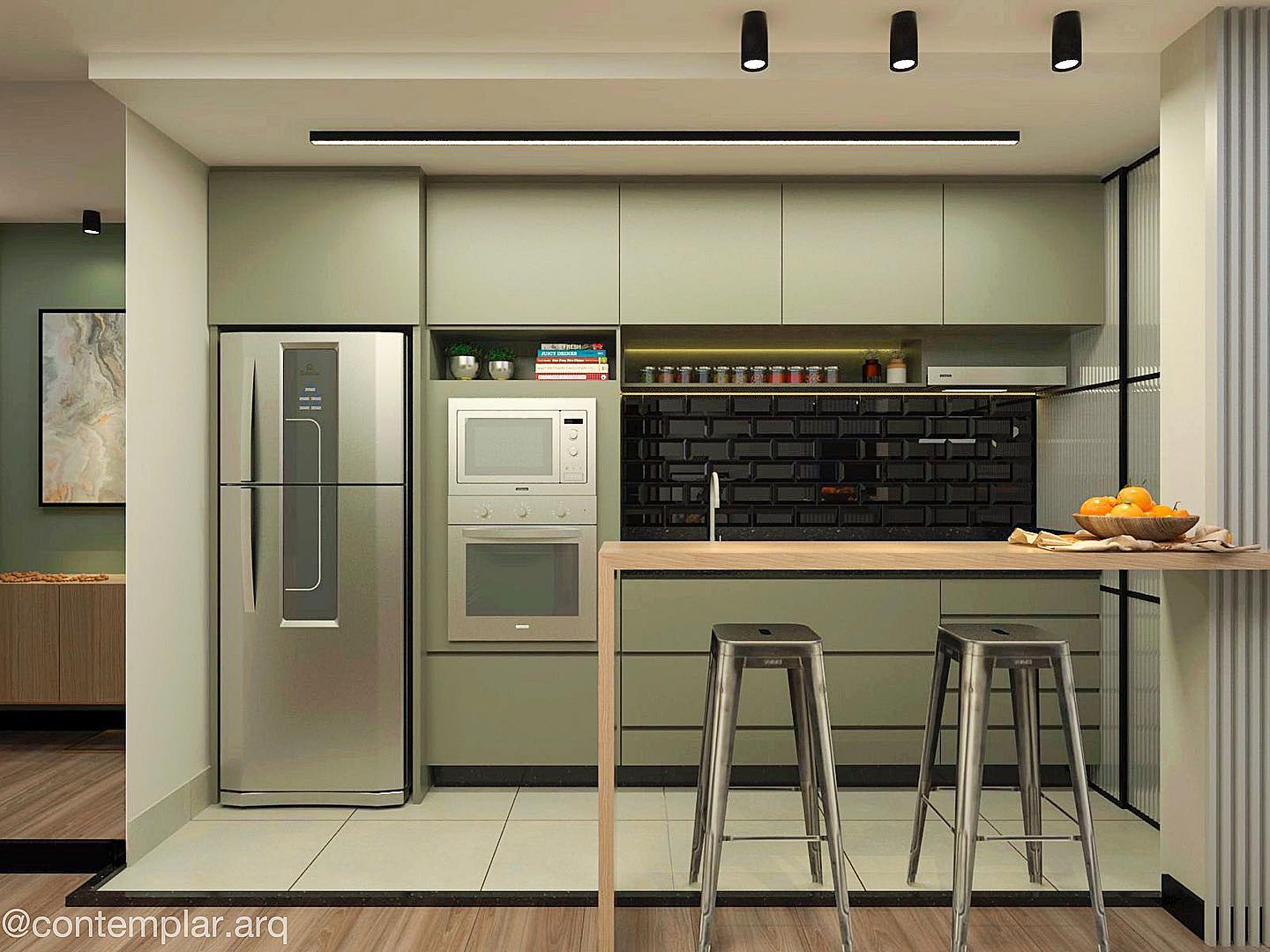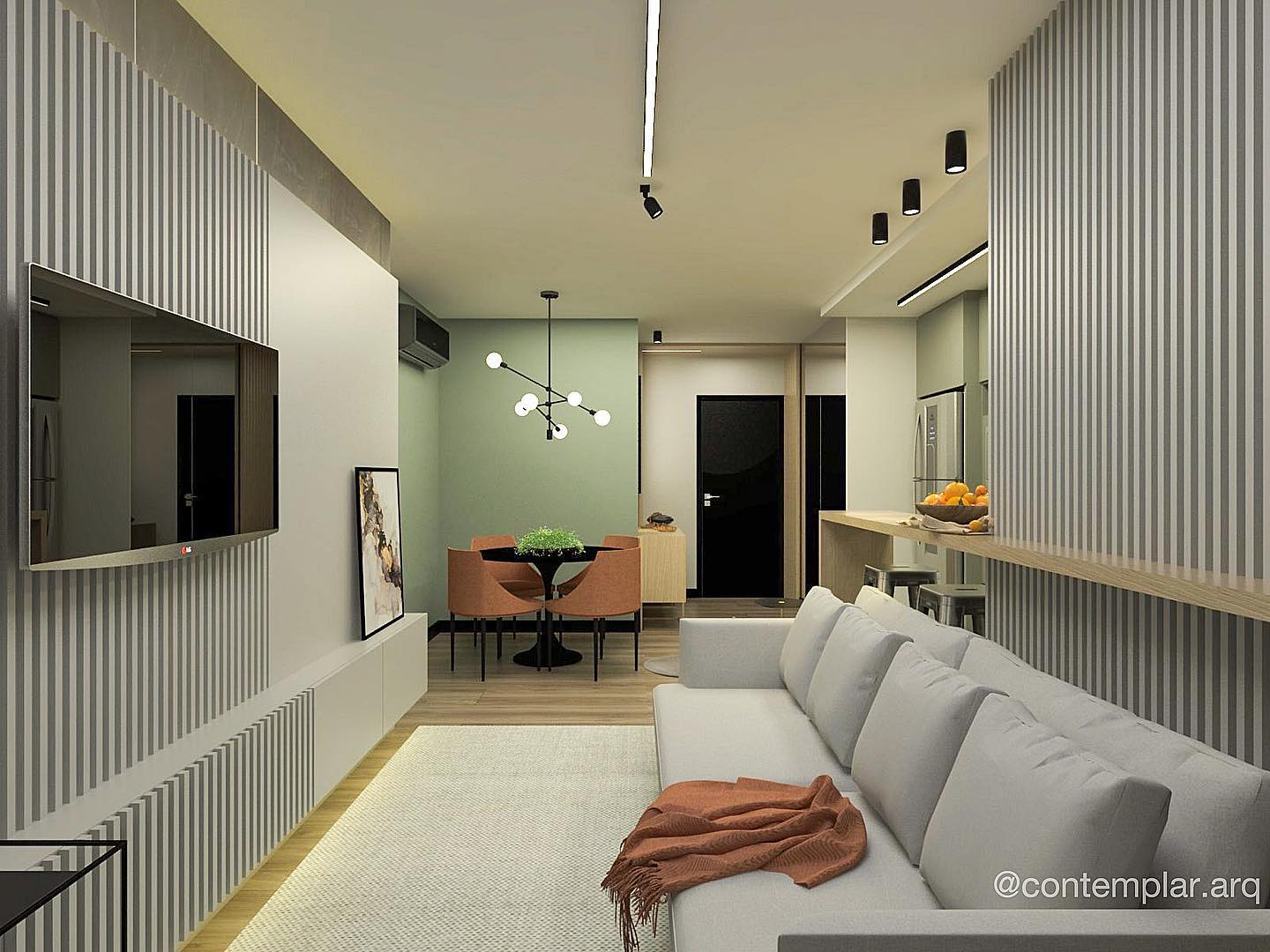 A primeira impressão é a que fica, por isso nesse apartamento apostamos em um hall de entrada moderno e bem receptivo, com uma iluminação aconchegante e um toque de cor para alegrar, a tinta escolhida para as paredes de entrada foi a cor pedra sabão da suvinil. Projetamos também um aparador de apoio para quem chega, com um design leve e elegante com a base em serralheria no dourado 💛 Nesse apartamento de 65 m2 apostamos na integração dos ambientes, gerando amplitude e fluidez no layout. A divisão entre a sala e cozinha foi feita com uma bancada para refeições rápidas, além de servir como mais dois lugares para recepcionar visitas 😊 Criamos um painel de TV super contemporâneo com linhas retas e uma composição de materiais diferentes em tons de cinza, trazendo leveza para o ambiente 🖤 Separamos também um cantinho especial para abrigar um mini bar🍸 Na Cozinha, com tom jovial e de muita personalidade, optamos pelo mesmo tom de mdf em todos os armários contrastando com a cor preta do revestimento, e na bancada para refeições preferimos um amadeirado para aquecer o ambiente✨ A iluminação indireta embutida nos armários traz um charme a mais, além de auxiliar a área de preparo, agregando funcionalidade ao projeto! Amamos o resultado desse projeto, moderno e com muita personalidade!! 💛💡