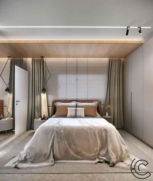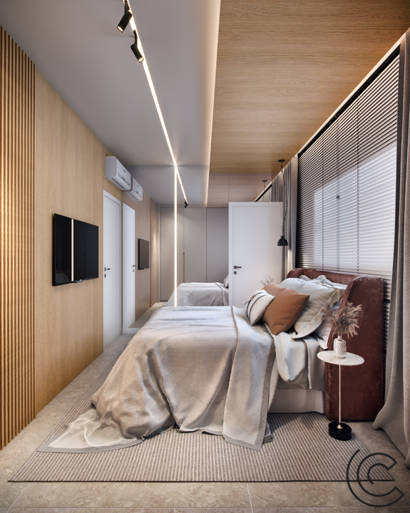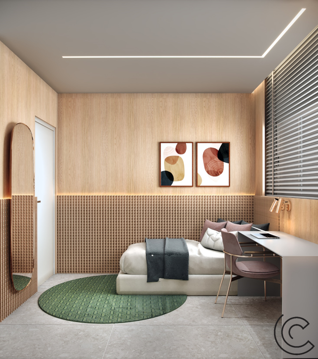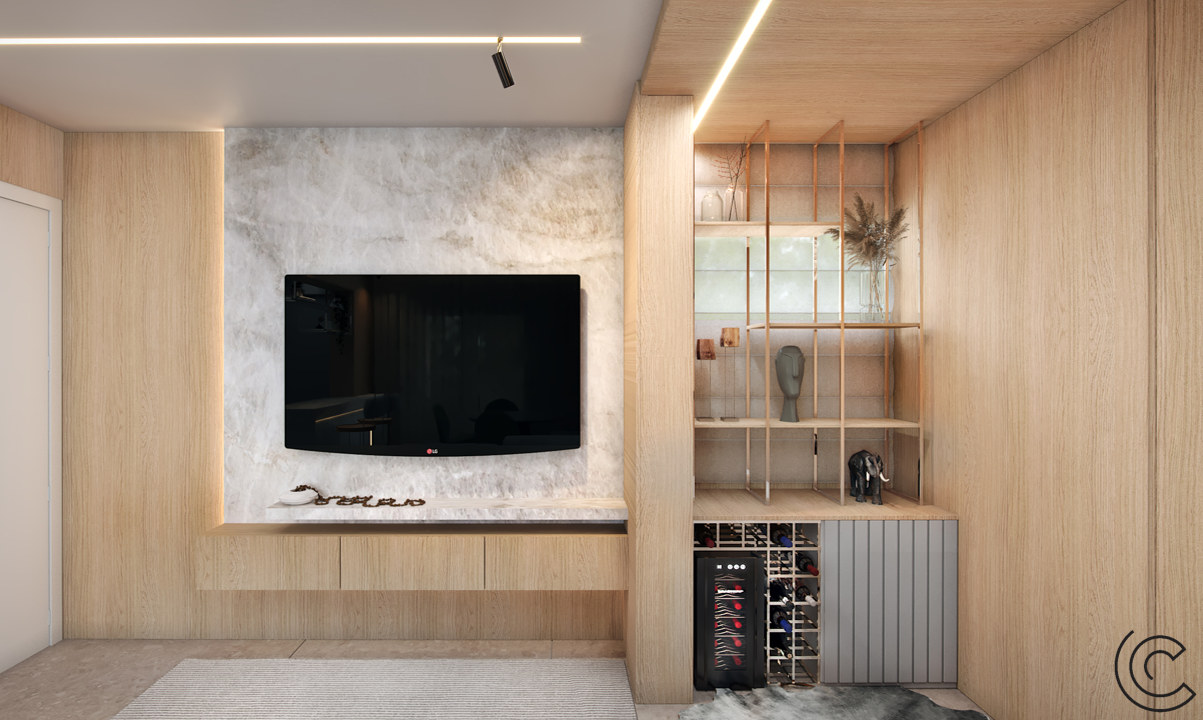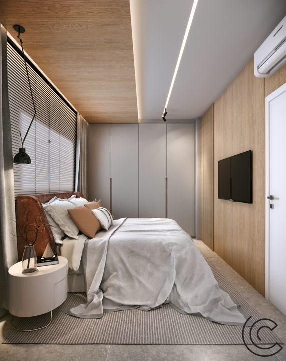 Abusamos da madeira e trouxemos uma iluminação na medida, com teto limpo e funcional.