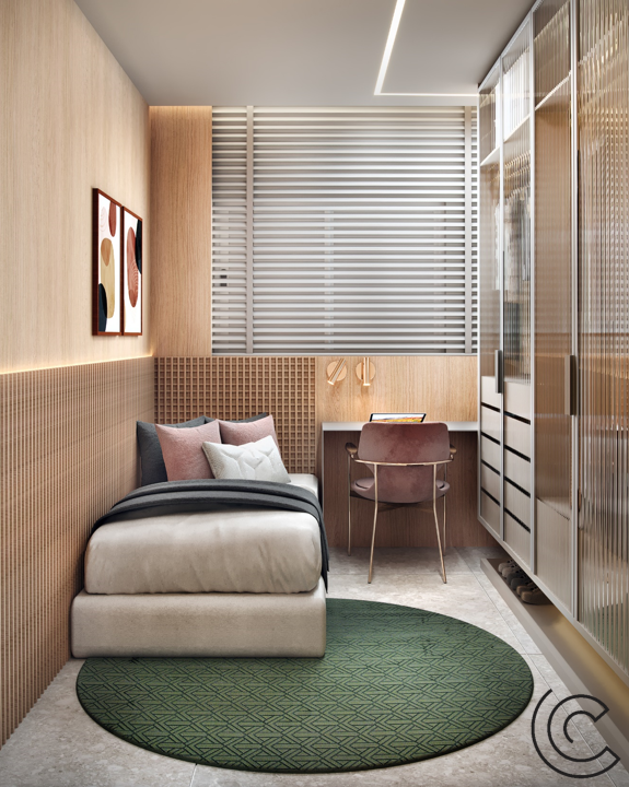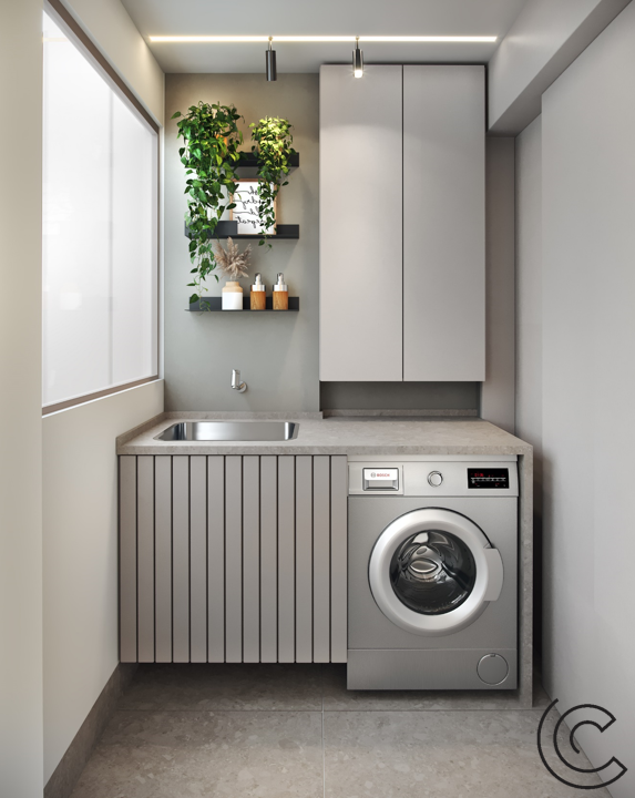 Para os tons da marcenaria apostamos em uma base neutra puxando para o cinza, uma proposta certeira e atemporal.