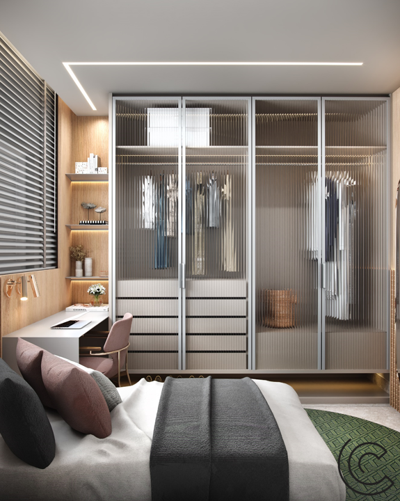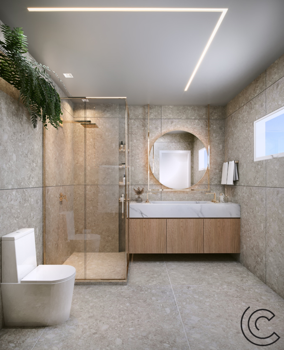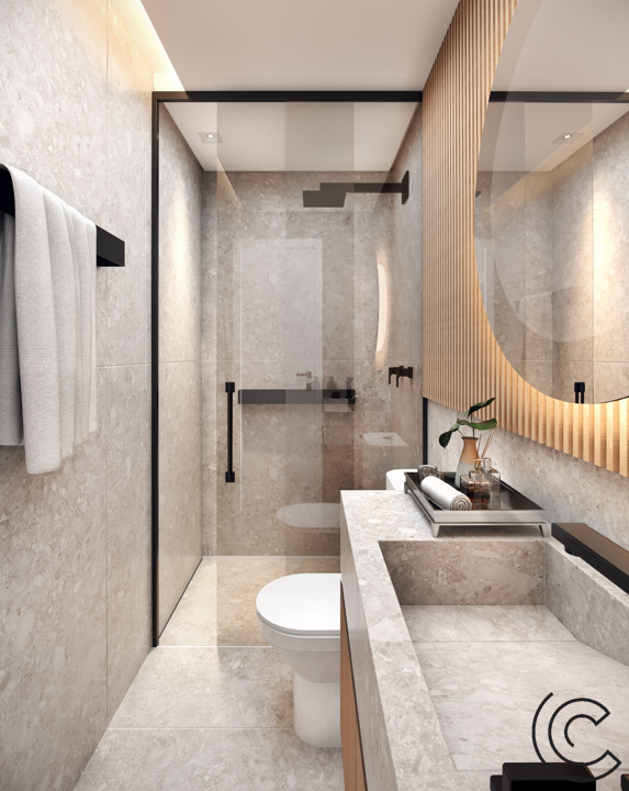 Composto por tons sofisticados e diferentes materiais, mantendo um visual leve, acolhedor e sofisticado. O destaque fica por conta da pedra quartzito, perla santana, maravilhosa.
