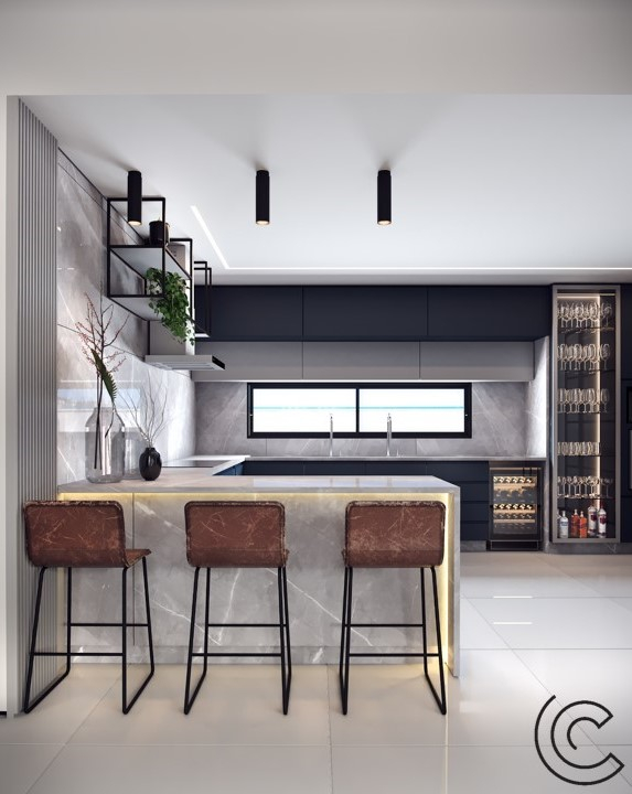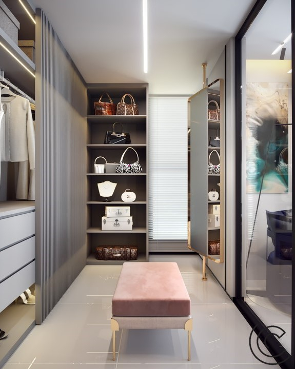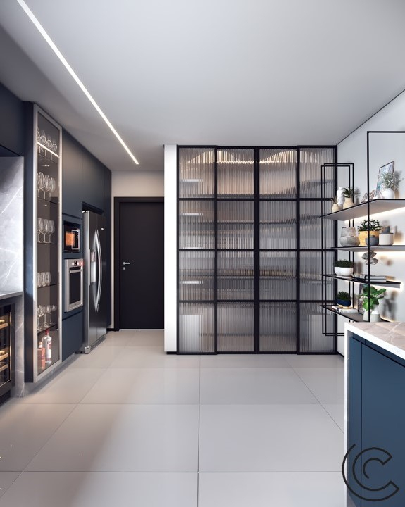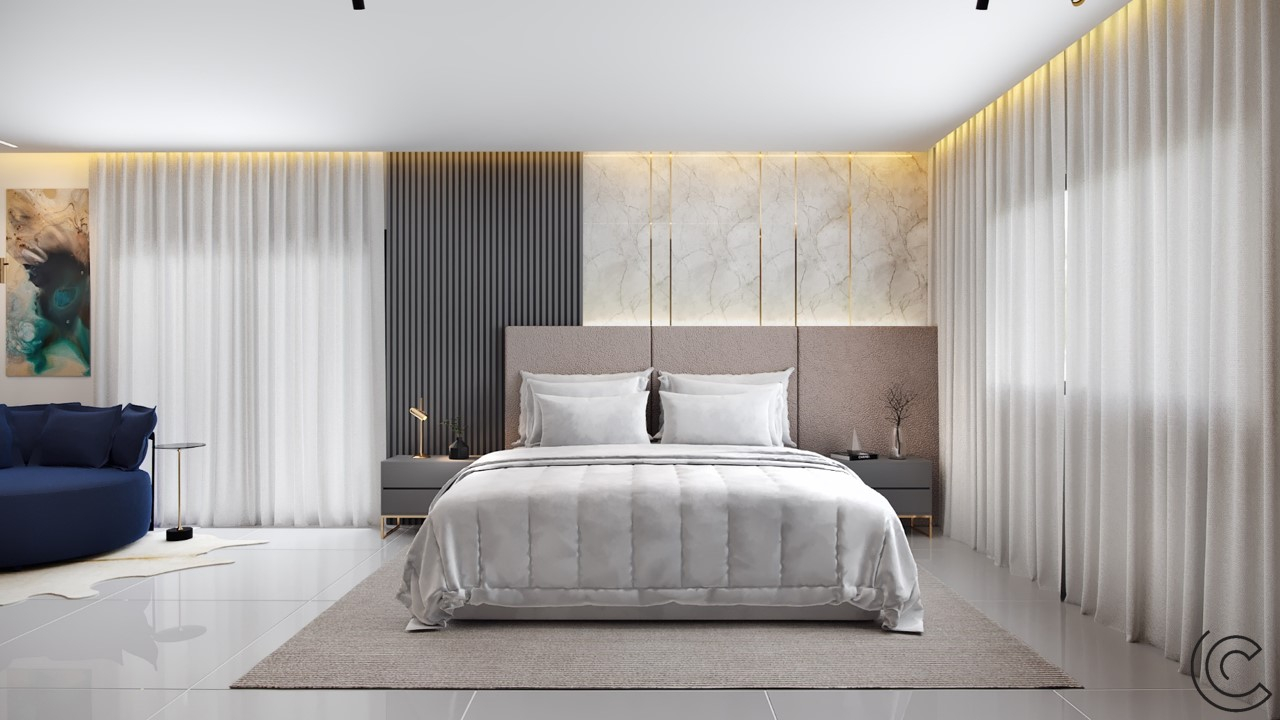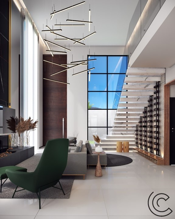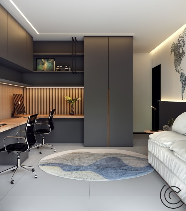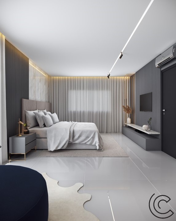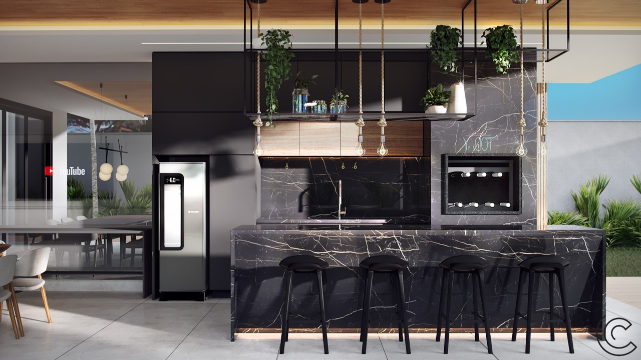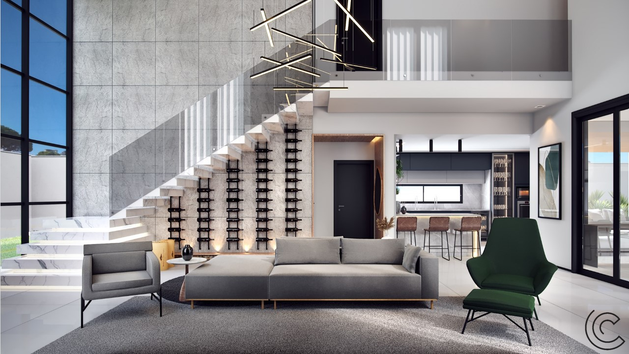 Iluminação funcional e linear, diferentes texturas e um toque de cor contrastando com os tons sóbrios, trazendo personalidade e autenticidade para toda a proposta.