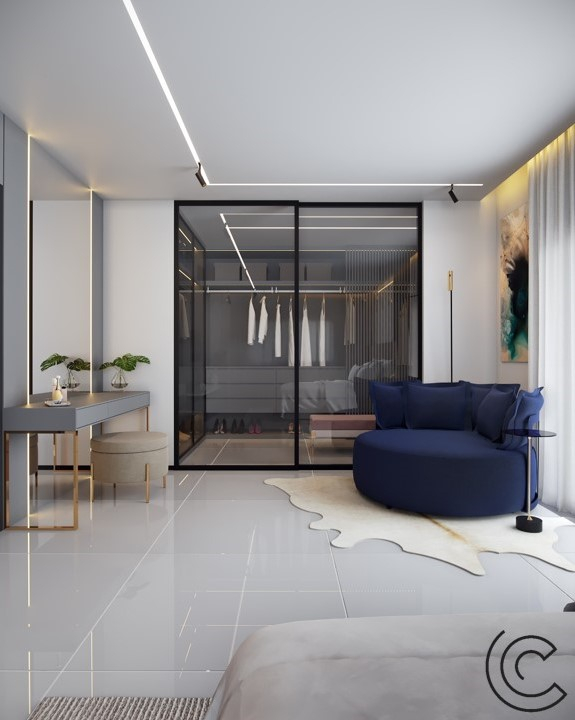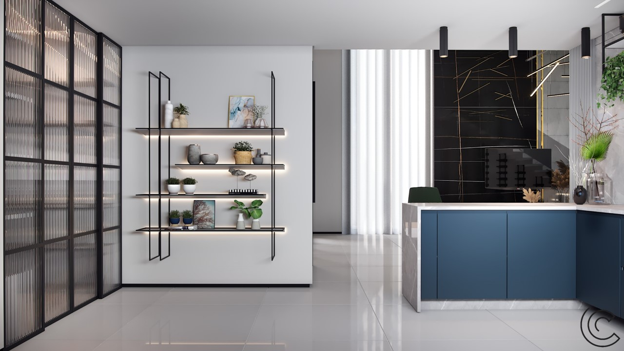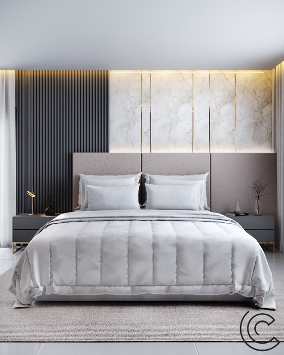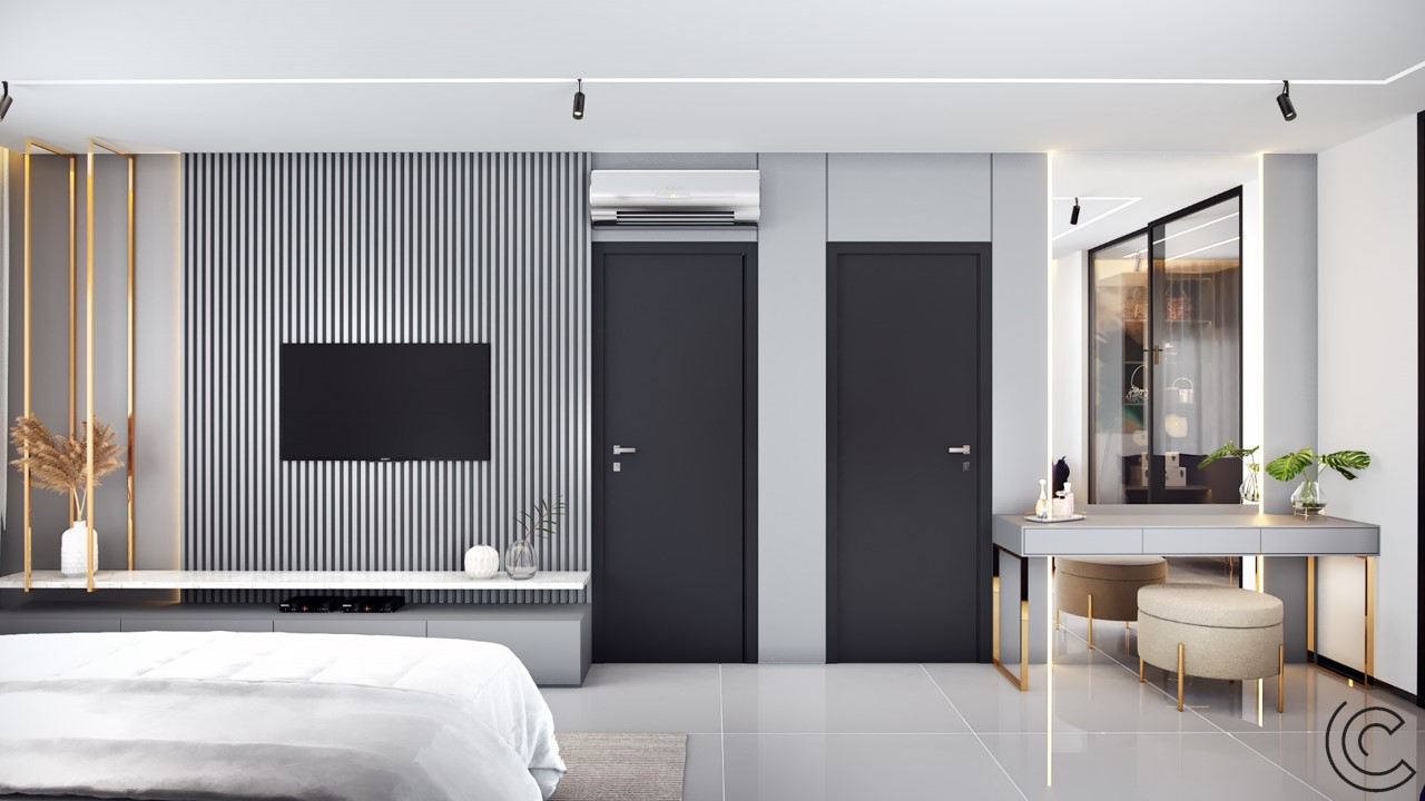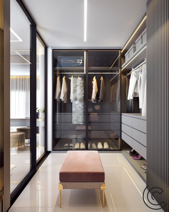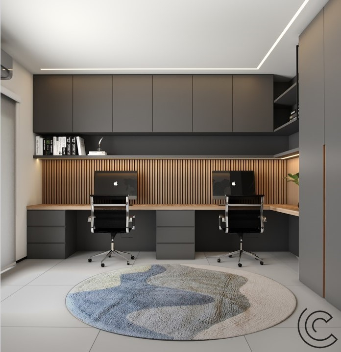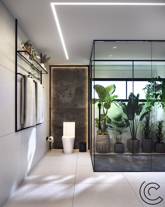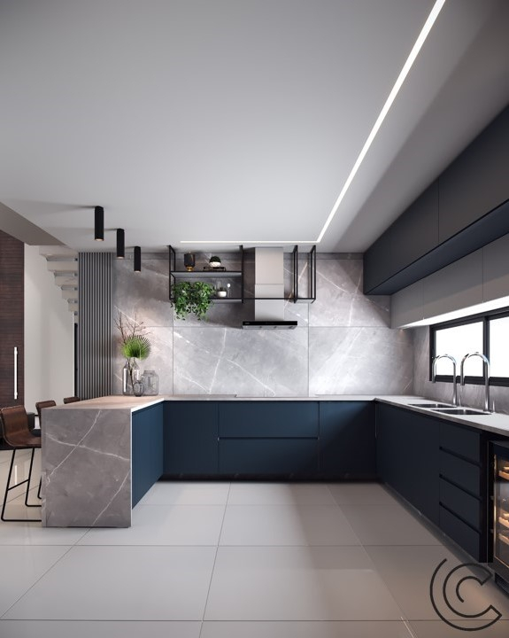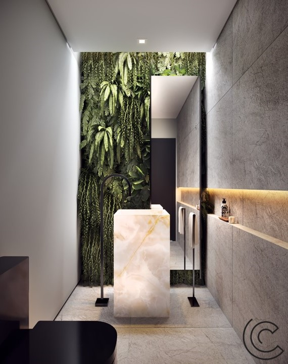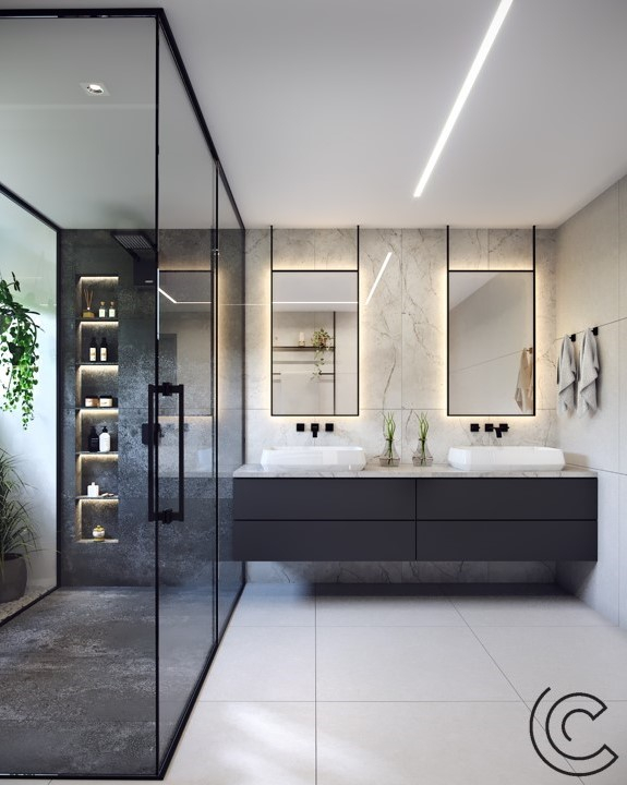 Iluminação funcional e linear, diferentes texturas e um toque de cor contrastando com os tons sóbrios, trazendo personalidade e autenticidade para toda a proposta.